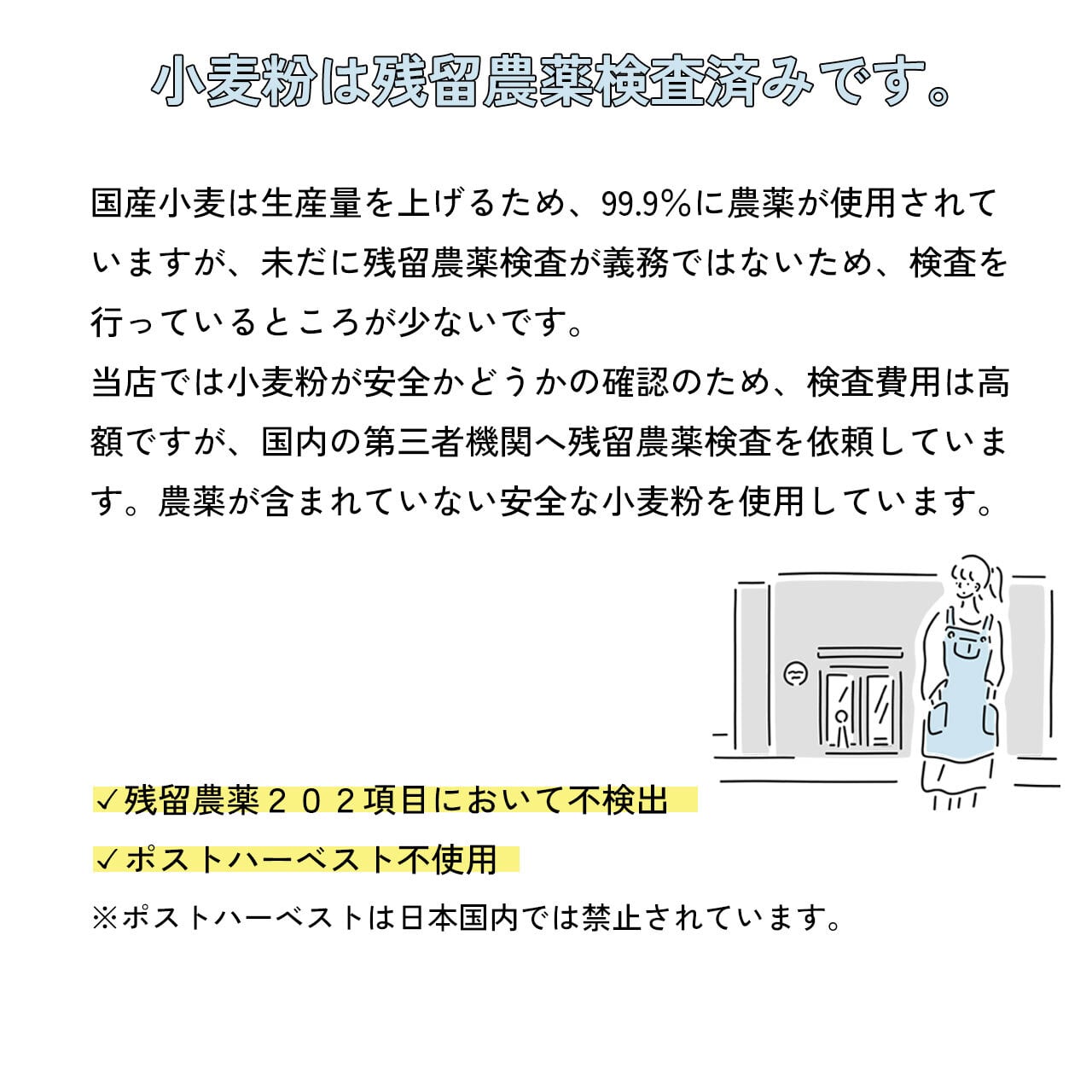 当店では使用している小麦粉が安全かどうかの確認のため、検査費用は高額ですが、国内の第三者機関へ残留農薬検査を依頼しています。
