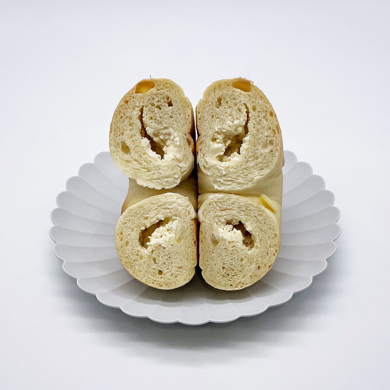 瀬戸内産のレモンの皮を生地に混ぜ、瀬戸内産のレモンを使用して作られた山田養蜂場さんのレモンはちみつ漬けと北海道乳業社の北海道クリームチーズ(リュクス)を混ぜて作った蜂蜜レモンクリームチーズが中に入っています。