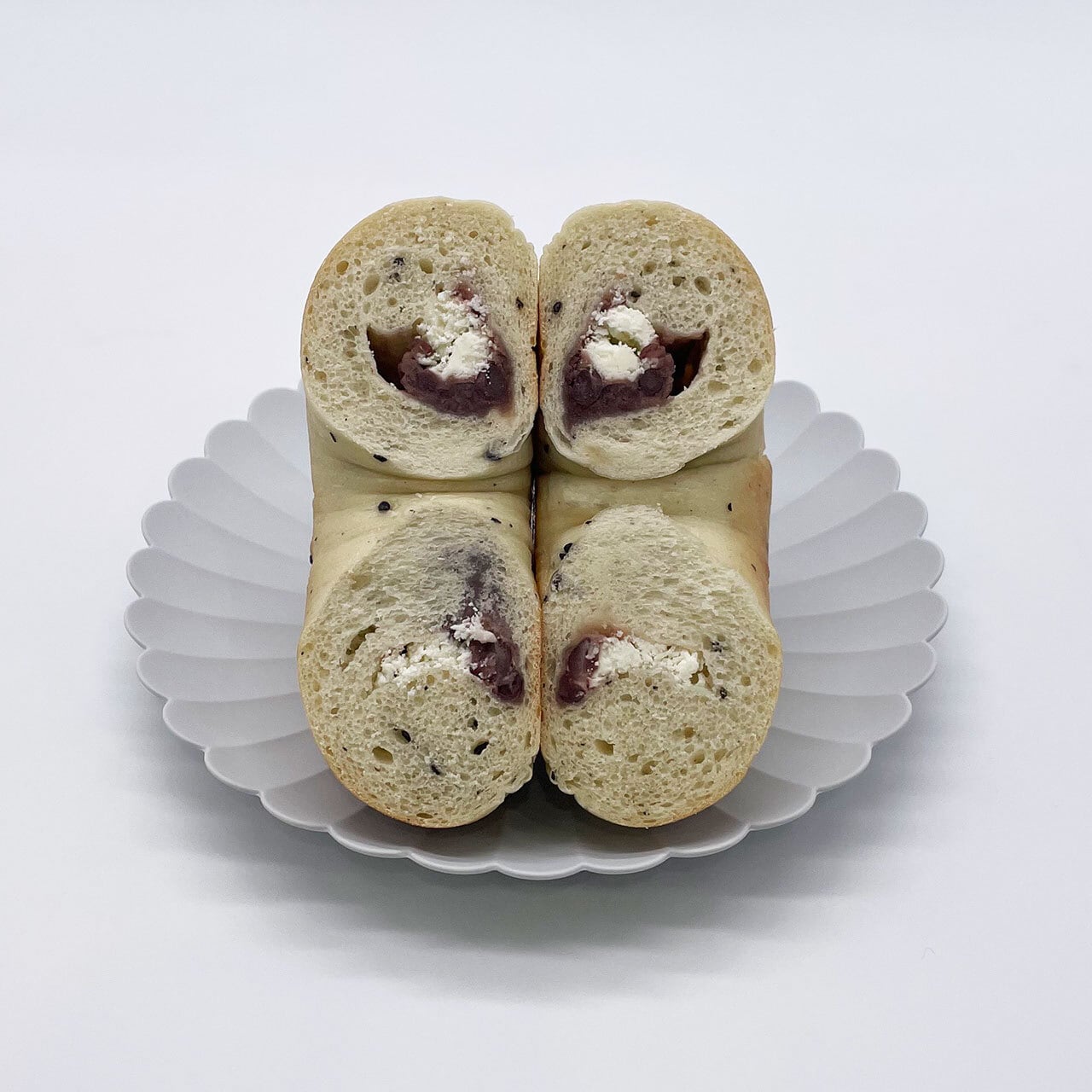 国産の黒ごまを生地に混ぜ、ベーグルの中には宮地館さんの高級粒あんと北海道産生乳100%のクリームチーズを入れて焼いています。粒あんは北海道十勝産の小豆と砂糖と塩のみで作られています。