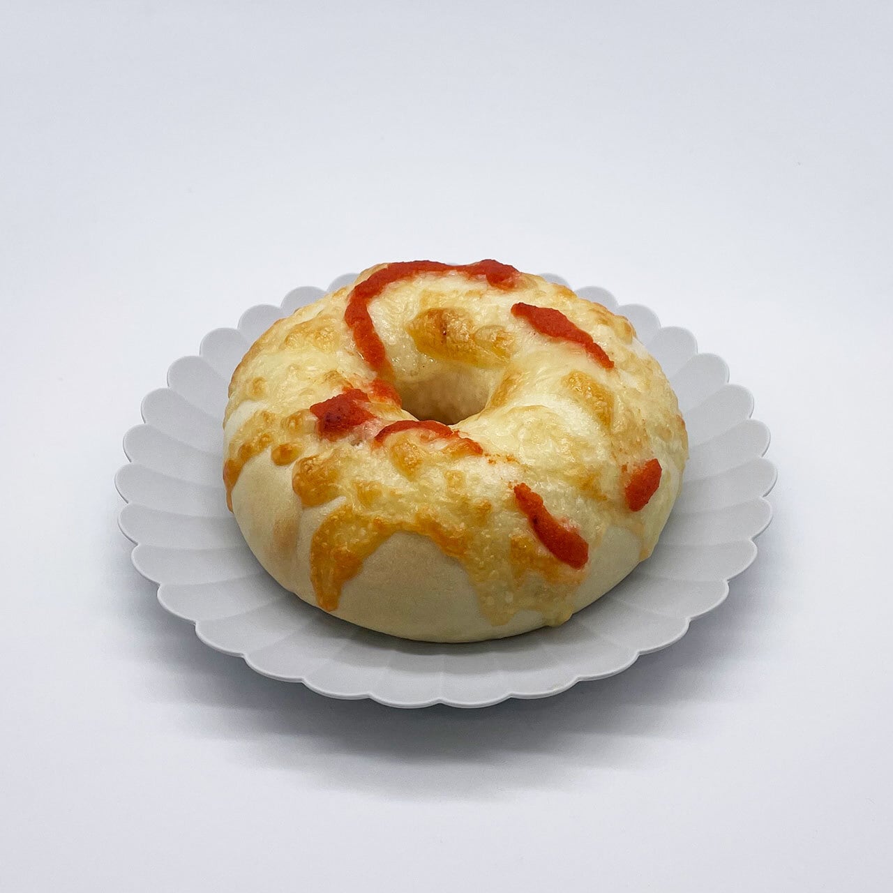 プレーン生地にかねふくさんの明太子を入れ、よつ葉乳業社の北海道十勝産の良質な生乳から作られたシュレッドチーズ(セルロース不使用)と明太子をのせて焼いています。