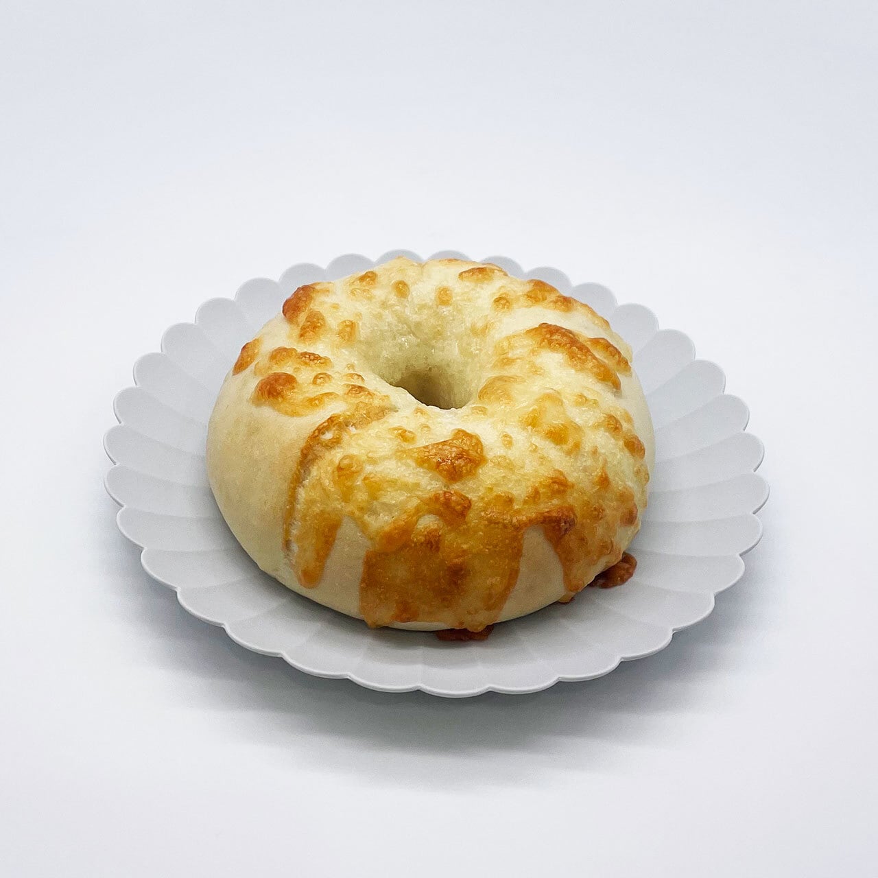 北海道産の生乳100%で作られたダイスチーズをベーグルの中に入れ、よつ葉乳業社の北海道十勝産の生乳100%で作られたシュレッドチーズ(セルロース不使用)をのせて焼いています。